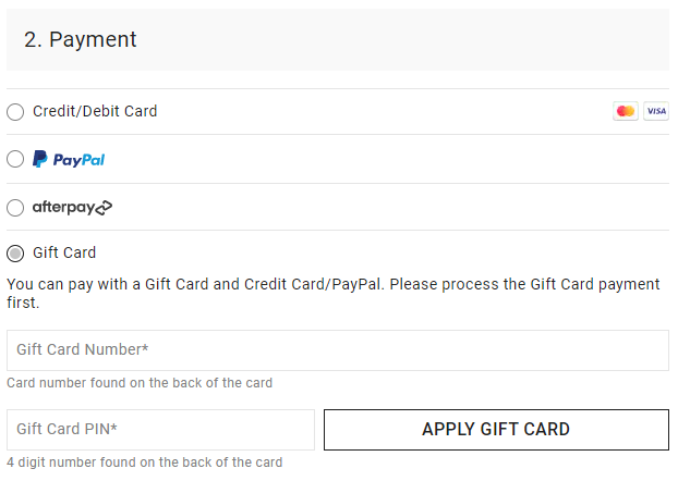 You can combine your gift card payment with a Credit\Debit Card or PayPal. Please ensure that you enter your gift card details first. - Enter the Gift Card number and 4 digit Gift Card PIN located under the scratch panel.