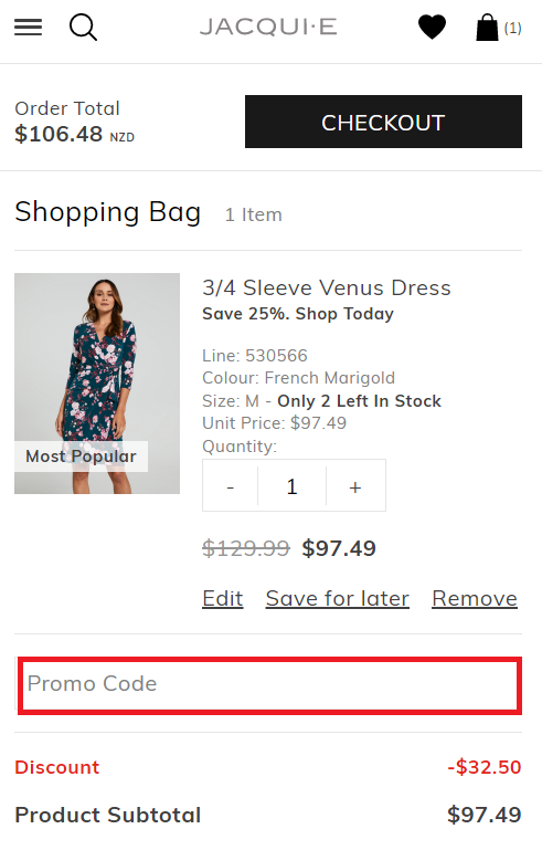 The Promo Code field is located underneath the list of products in your shopping bag when viewing on a mobile device.